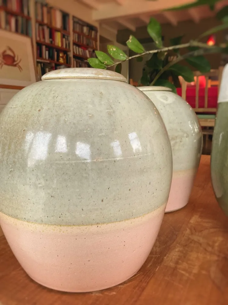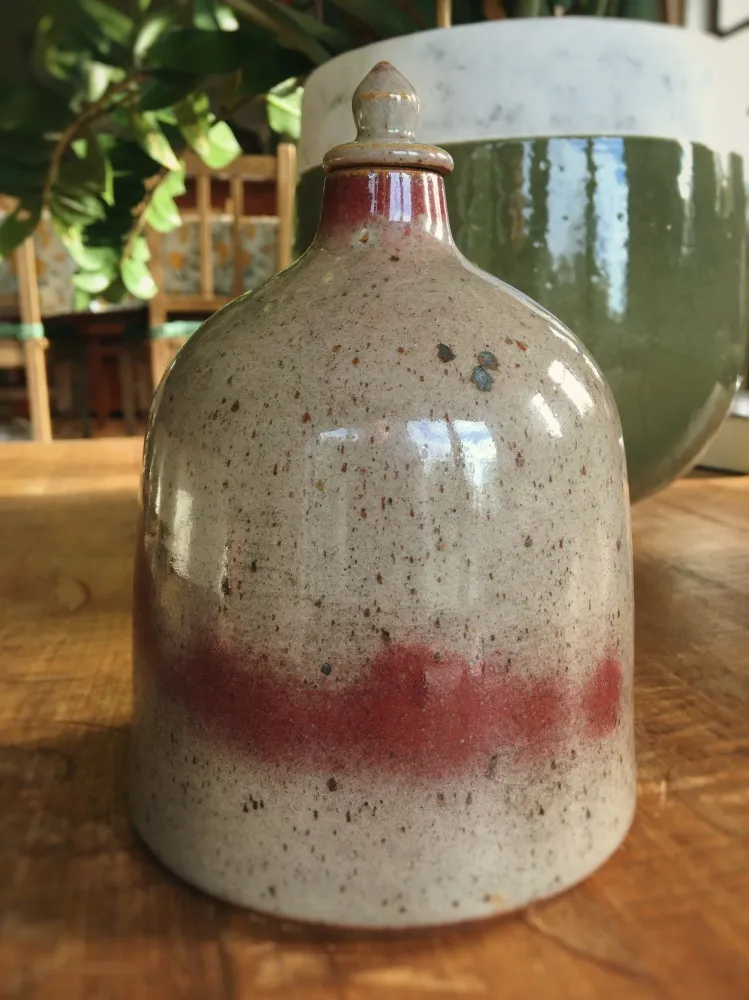 Model Diona in craquelé keramiek, volume 4,5 liter, geglazuurd in shino, met plat dekseltje en voorzien van een hangertje met inscriptie