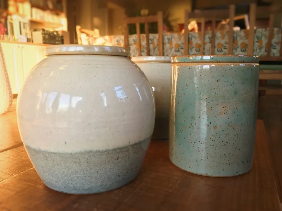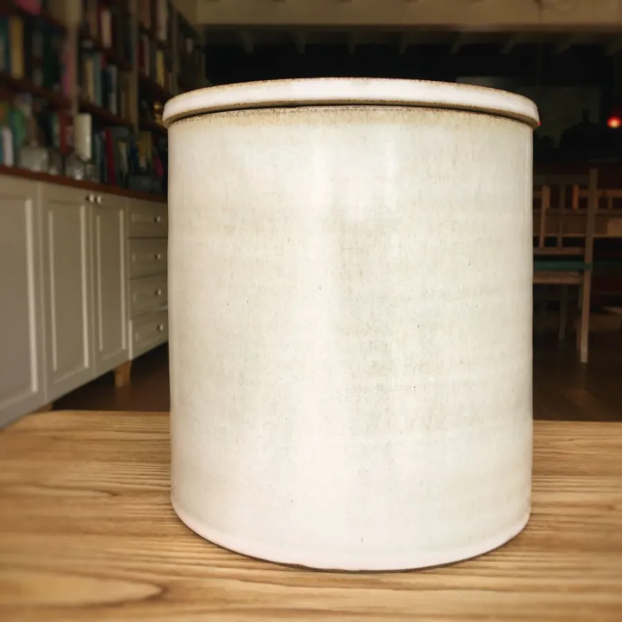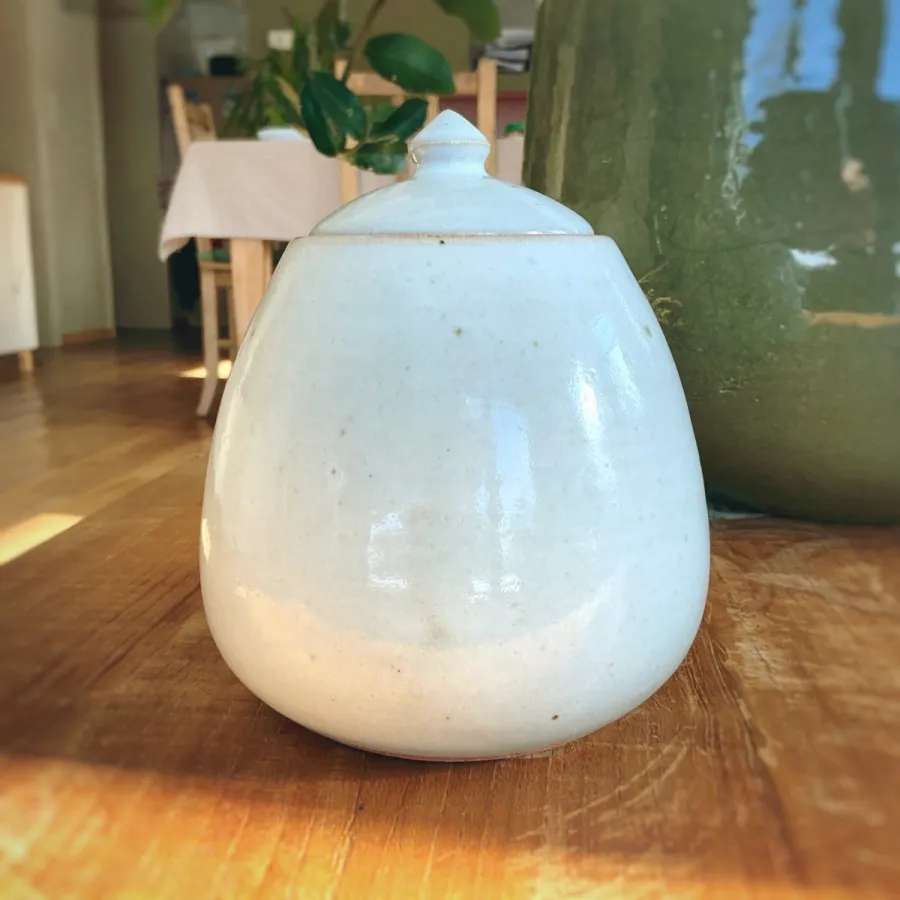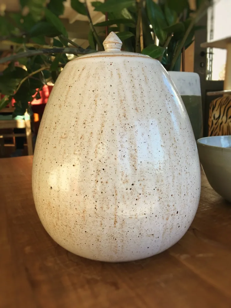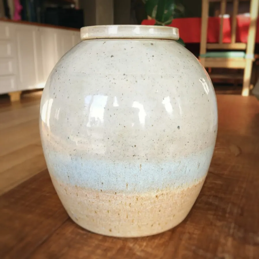 Model Diona in craquelé keramiek, volume 4,5 liter, geglazuurd in shino, met plat dekseltje en voorzien van een hangertje met inscriptie