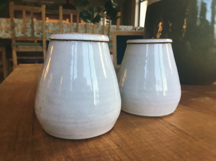 Links: Model Verno, volume 700 ml, geglazuurd in crèmewit & crèmegroen / Rechts: Model Pelion, 600 ml