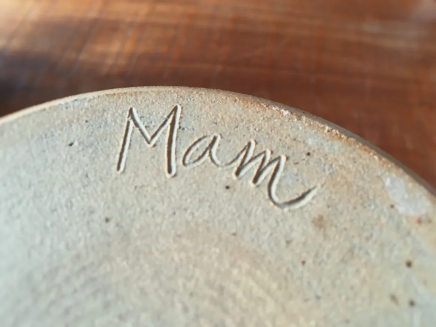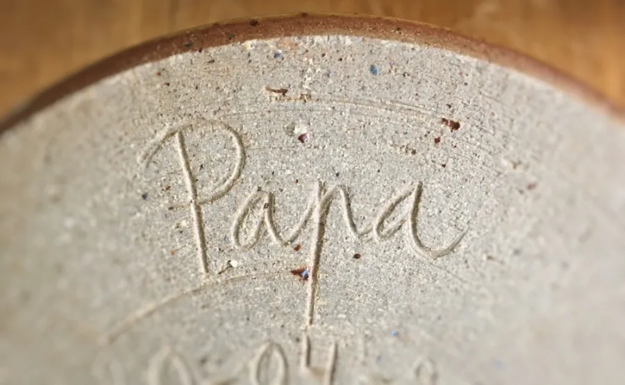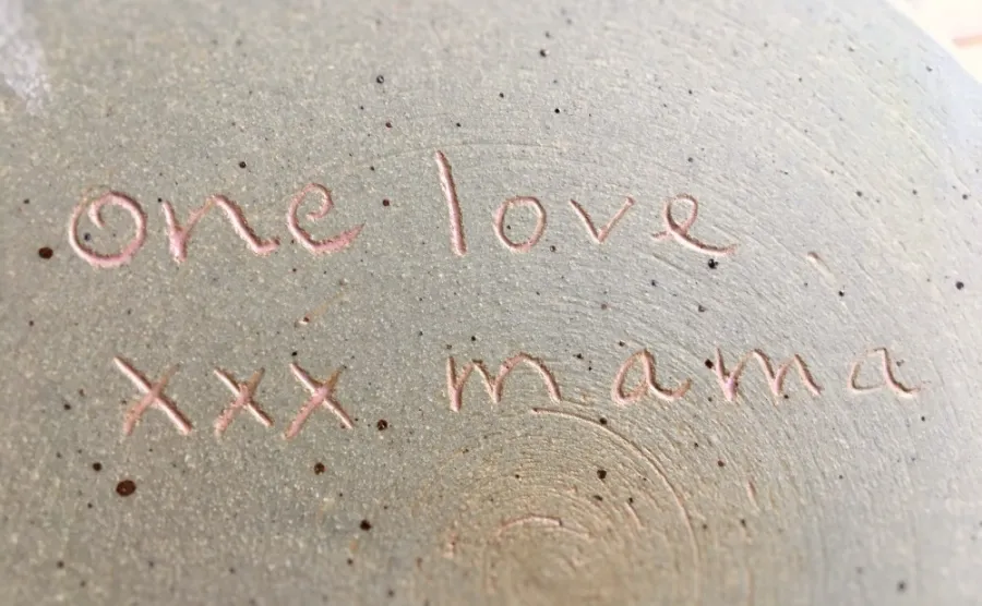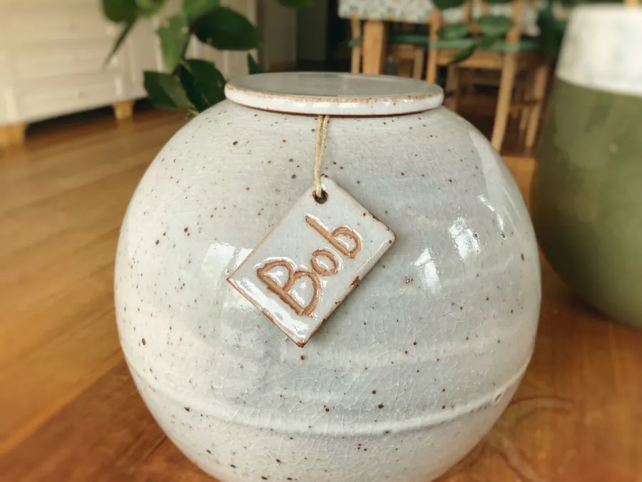 Persoonlijke inscriptie onderaan een op maat gemaakte urne in keramiek